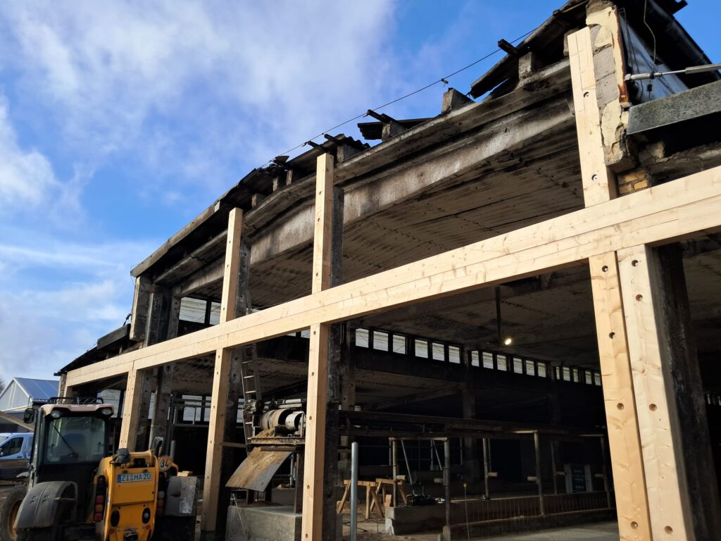 Nachdem der Altgiebel in massiver Bauweise marode geworden war, erfolgten für die MIKU Agrarprodukte GmbH Abbruch und zeitgemäße Neuerrichtung eines Giebels in Holzbauweise mit großen Toröffnungen, einer Unterkonstruktion für die Giebelverblechung sowie Torschienen auf einer Gesamtgiebellänge von 23 m und 8 m Höhe. Die Holzbauteile wurden auf der Länge zimmerermäßig mit einem Gerberstoß verbunden.